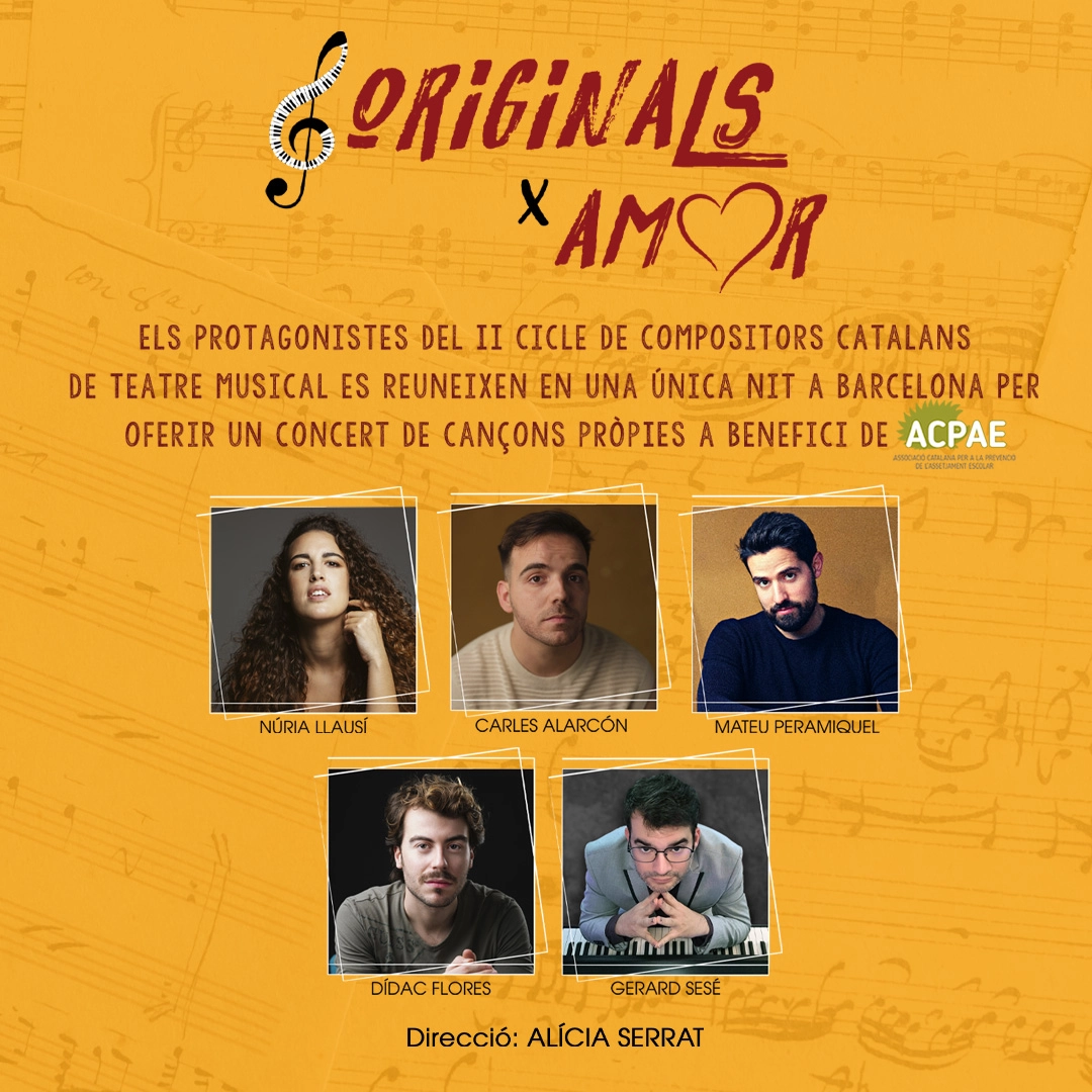Originals X Amor presenta en concert en una única nit un recull de les cançons dels cinc compositors que durant el primer semestre de 2024 han protagonitzat a la sala Encuentro, a Abrera, els cinc concerts de la segona edició del cicle Originals, Cicle de Compositors Catalans de Teatre Musicals. Aquests compositors són: Núria Llausí, Carles Alarcón, Mateu Peramiquel, Dídac Flores i Gerard Sesé.