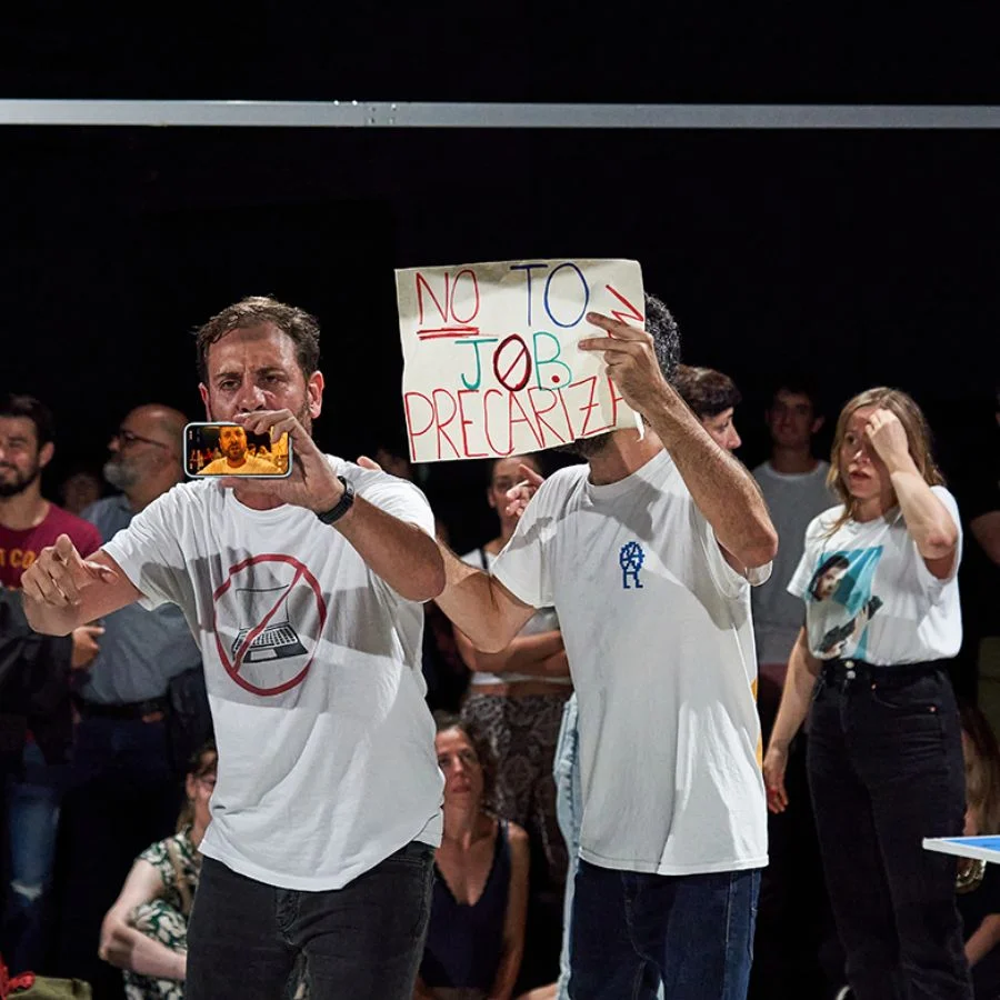 Un grup de joves freelancers presten servei, a través dels seus mòbils i ordinadors, per a una empresa multinacional. En un context de gran despersonalització del vincle laboral, decideixen organitzar un reclam. L’obra tracta sobre les noves dinàmiques laborals en l’era de les societats multitasking, en un món alhora connectat i dissolt.