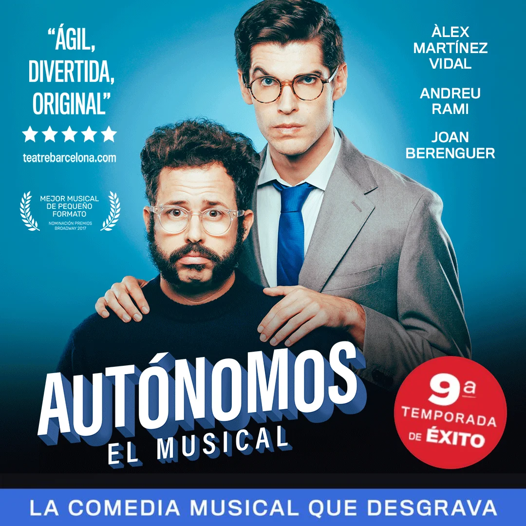 La comèdia Autónomos, el musical inicia la 9a temporada d’èxit! Un fenomen escènic sobre les peripècies d’un nou freelance per sobreviure al món laboral, a un guru de l’emprenedoria, a la cruel Agència Tributària ia un gestor molt particular. Aquesta comèdia d’aventures sobre l’amistat i la superació de dificultats ha triomfat gràcies a un ritme desenfrenat, llenguatge televisiu i altes dosis de crítica. Amb música en directe i els cameos especials d’Elisenda Carod, Jaïr Domínguez, Juanra Bonet, Alba Florejachs o Ignasi Taltavull i Tomàs Fuentes (La Ruina)!