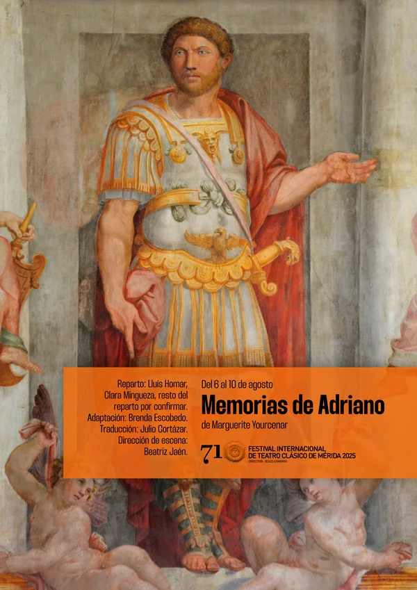 Memorias de Adriano és un espectacle basat en la novel·la Memorias de Adriano de Marguerite Yourcenar. Aquest text, mundialment conegut, és un testimoniatge en primera persona de la vida de l'emperador romà nascut a Espanya. És, en termes literaris, una falsa autobiografia. En termes teatrals, per tant, és una falsa personificació: Adriano no viu en el segle II, encara que el recordi. Aquesta unió de plans és l'univers del nostre muntatge. Amb un llenguatge ple de lirisme i amb una admiració cap al seu perfil hel·lènic, Yourcenar recrea la figura d'un mandatari tan savi i magnífic com a cec i contradictori. En tots dos perfils es dibuixa el gest de la solitud. Prenent aquest tema com a columna vertebral de l'espectacle, la directora Beatriz Jaén ha creat un espai escènic on els ressons d'aquesta solitud ressonen en l'actualitat del poder, de la política i de la creació d'una imatge pública.