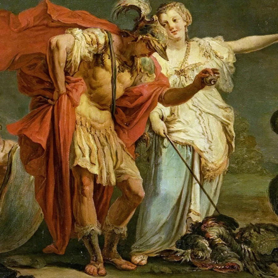 Tras hacerse con él gracias a la ayuda de Medea, Jasón le jura amor eterno y ambos huyen en busca de un lugar que los acoja. Al llegar a Corinto, Jasón pide ayuda al rey Creonte, pero este, a cambio de asilo, le exige casarse con su hija Creúsa.