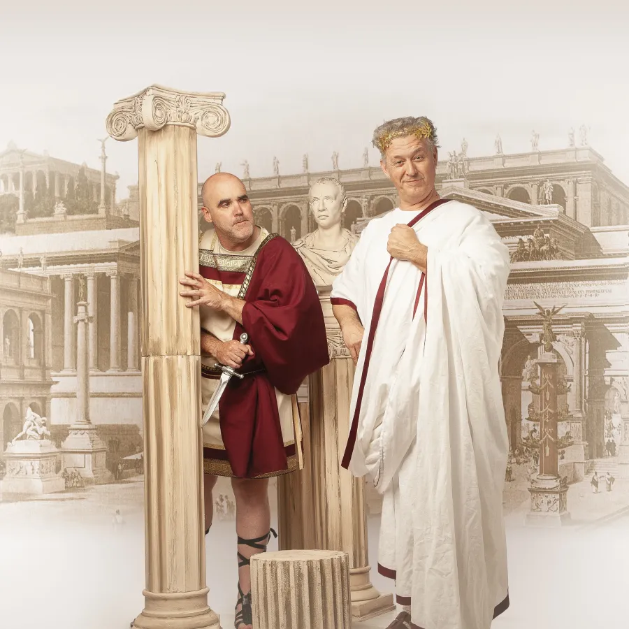 A través de gags y situaciones inverosímiles, dos personajes clownescos –un arqueólogo y un operario de obras decidido a construir un complejo turístico sobre unas antiguas termas romanas– nos transportan a una época llena de intrigas y extravagancias. Entre ruinas y cemento, reviviremos figuras míticas como Julio César, Cleopatra, Marco Antonio, los filósofos Cicerón y Séneca, ¡e incluso unos viejos conocidos irreductibles: Astérix y Obélix! Sin olvidar conspiraciones, traiciones y algunas apariciones inesperadas.