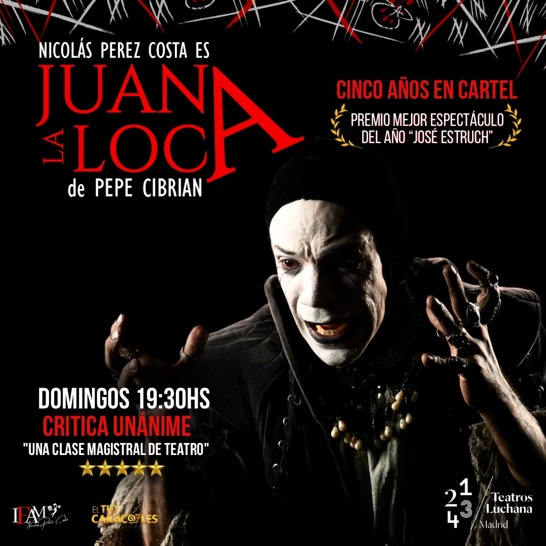 El prestigioso actor y director argentino, dirigido por el gran referente de la escena, el maestro Pepe Cibrian, interpreta siete personajes con un vértigo y precisión tal que hace que esta pieza sea un tornado, un alud de poética y belleza. Una mujer que enfermó de celos y de amor, que luchó contra un sistema patriarcal que no solo sobresalía en el palacio… Sino también en su alcoba. Un trono y la oscuridad inherente que rodea a Juana en sus últimos instantes de vida. Una catarata de imágenes que necesitan ser revividas, un texto maravilloso que evoca a los grandes autores españoles; sus formas, imágenes y poética.